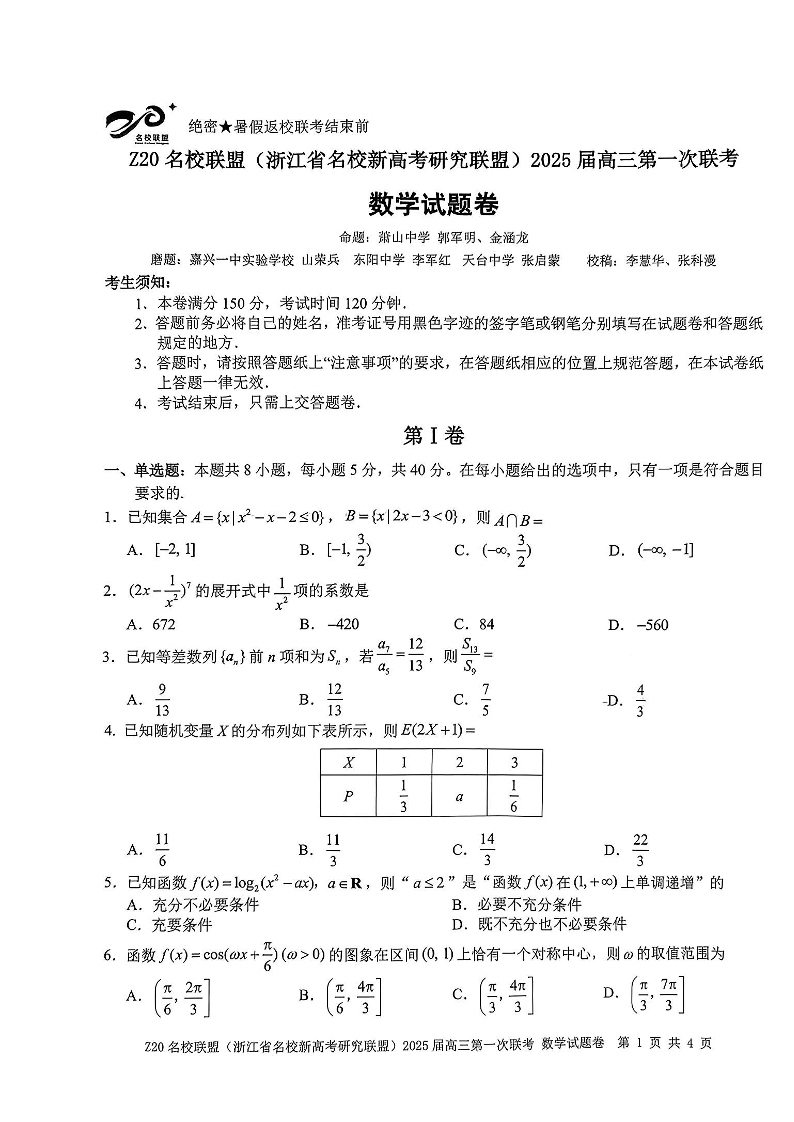 浙江省Z20名校联盟(浙江省名校新高考研究联盟)2025届高三第一次联考 数学