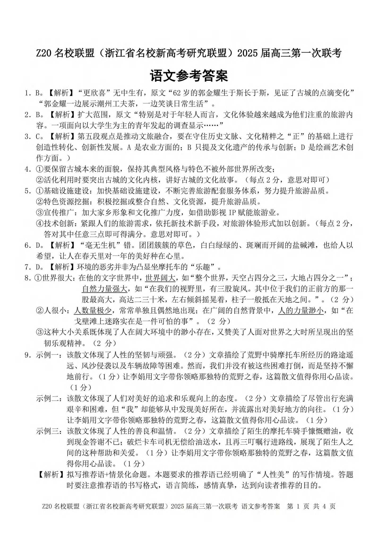 浙江省Z20名校联盟(浙江省名校新高考研究联盟)2025届高三第一次联考 语文答案