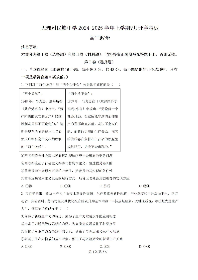 云南省大理白族自治州民族中学2024-2025学年高三上学期开学考试 政治