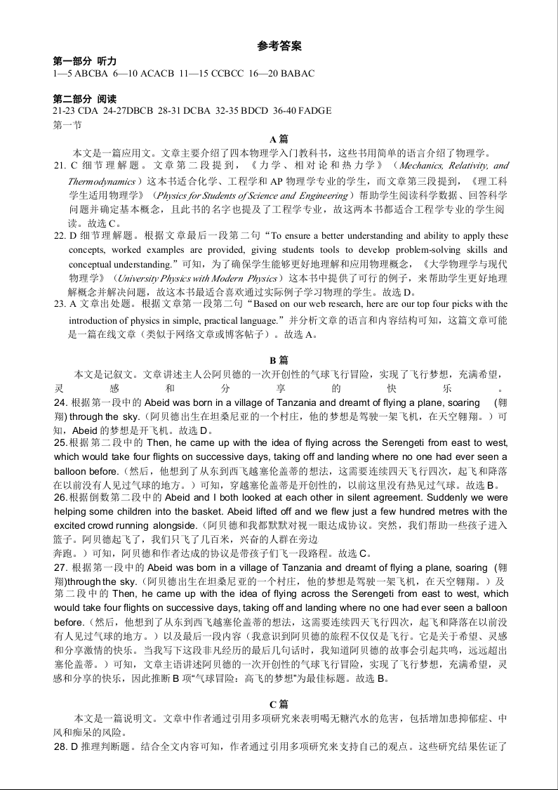 云南省大理白族自治州民族中学2024-2025学年高三上学期开学考试 英语答案
