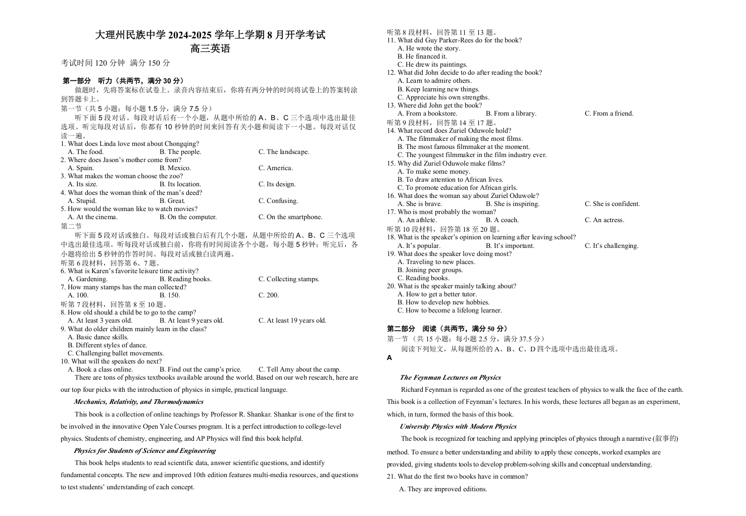 云南省大理白族自治州民族中学2024-2025学年高三上学期开学考试 英语