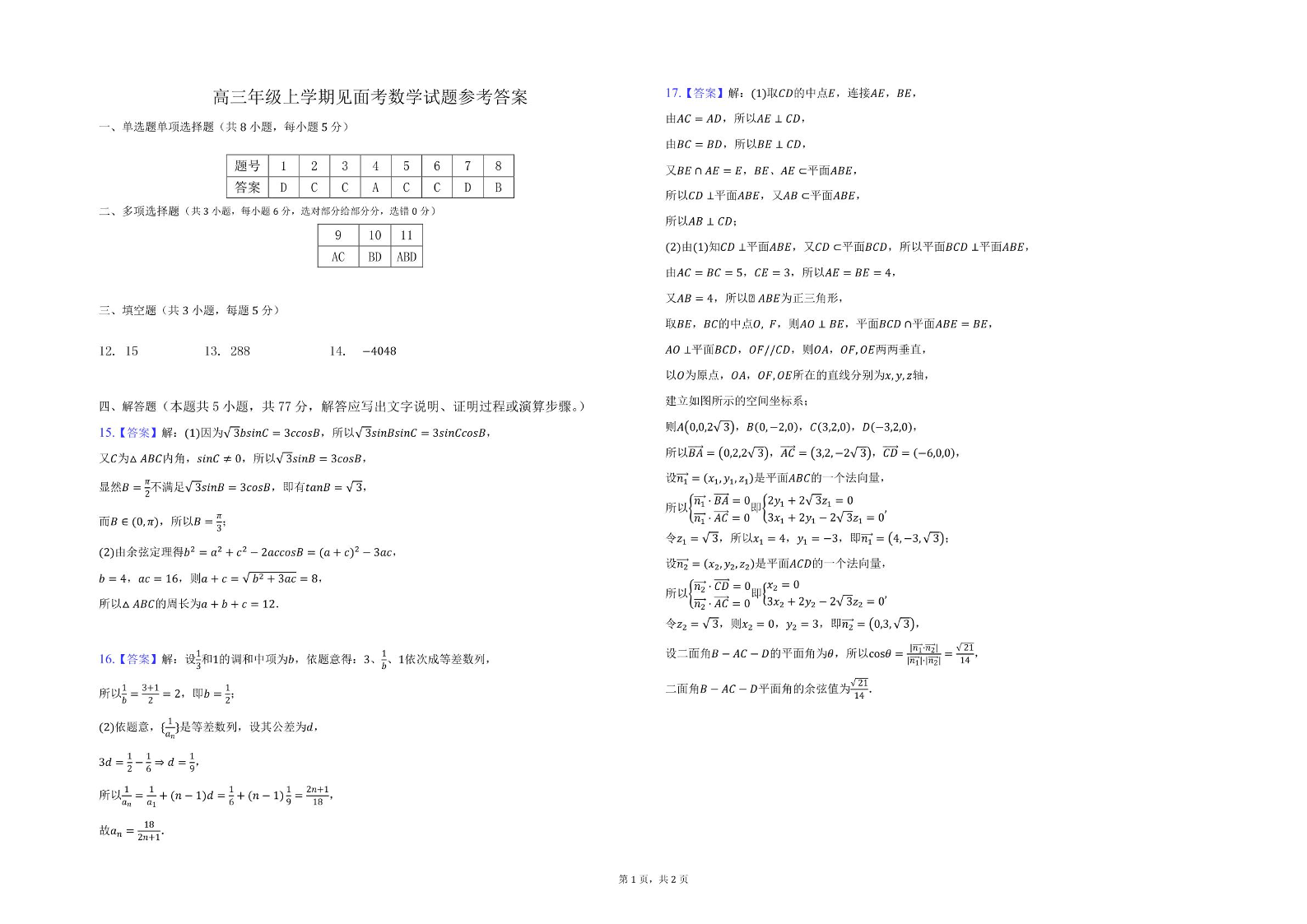云南省大理白族自治州民族中学2024-2025学年高三上学期开学考试 数学答案