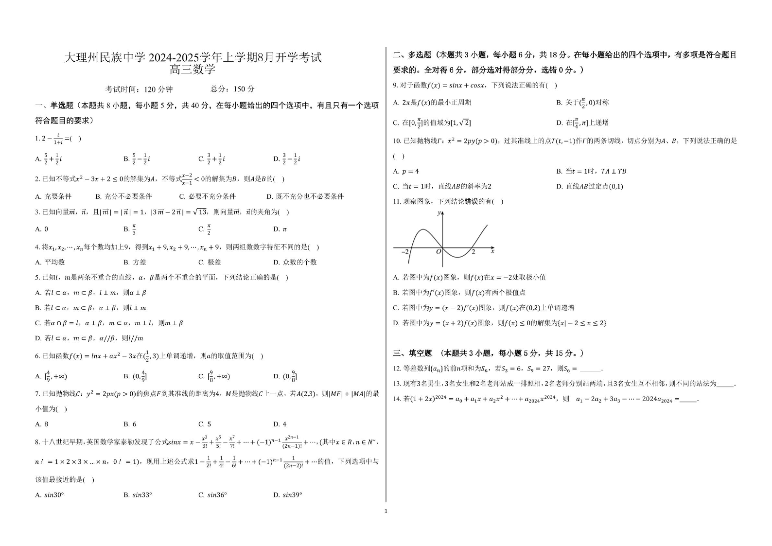 云南省大理白族自治州民族中学2024-2025学年高三上学期开学考试 数学