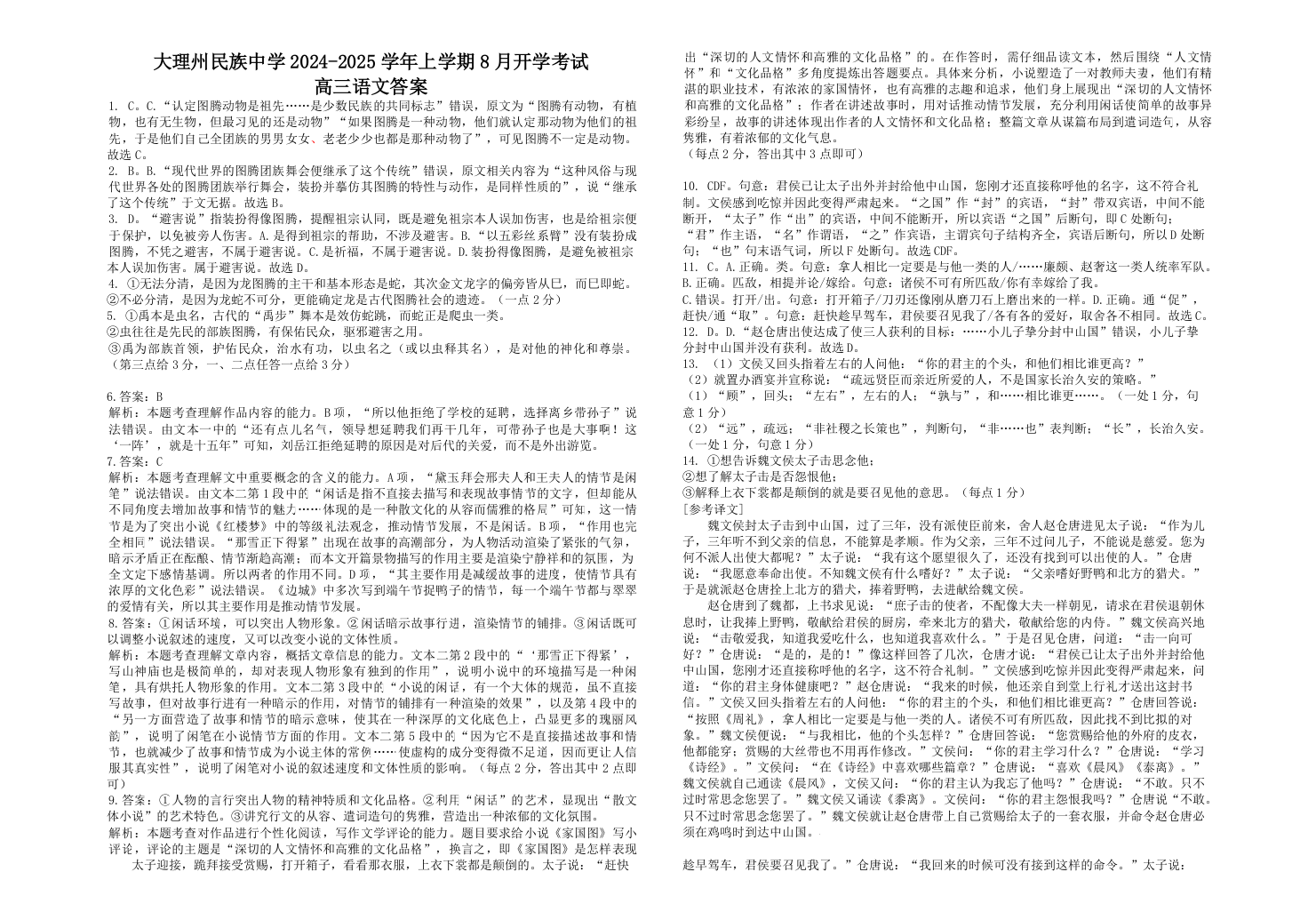 云南省大理白族自治州民族中学2024-2025学年高三上学期开学考试 语文答案