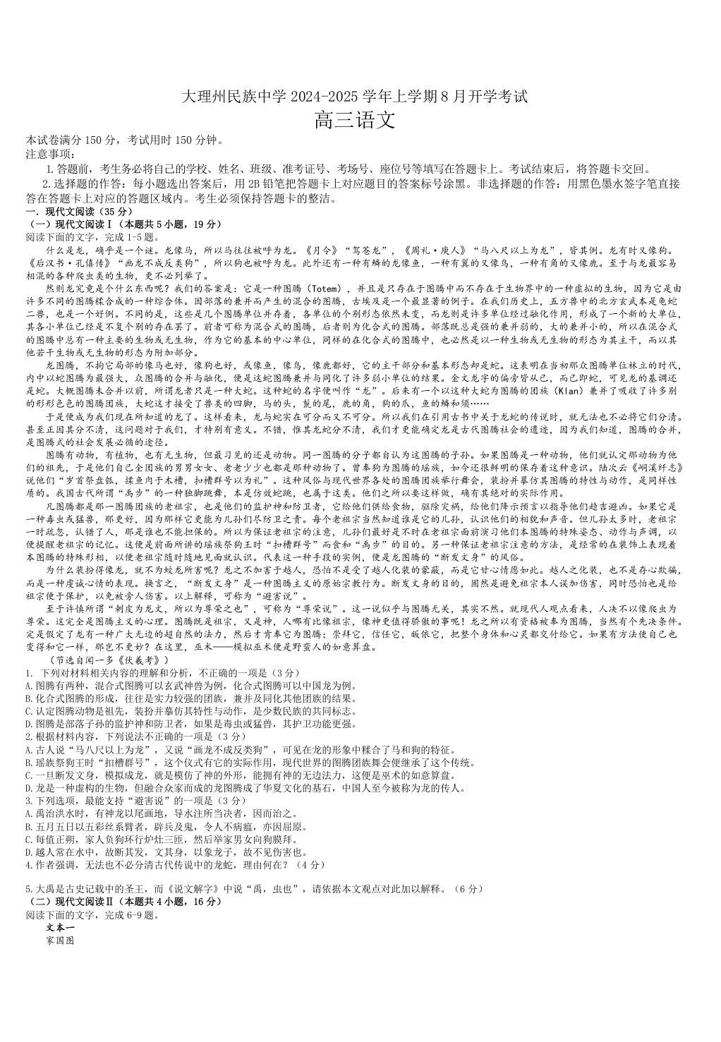 云南省大理白族自治州民族中学2024-2025学年高三上学期开学考试 语文