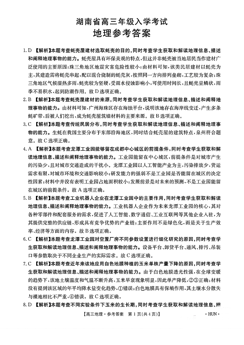 湖南省部分学校2025届高三年级8月入学考试 地理答案