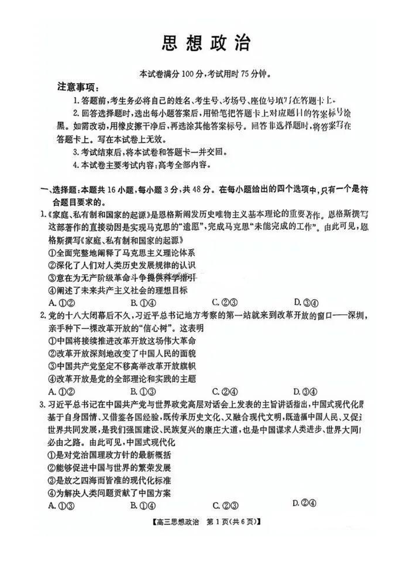 湖南省部分学校2025届高三年级8月入学考试 政治