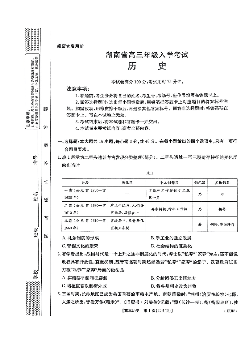 湖南省部分学校2025届高三年级8月入学考试 历史