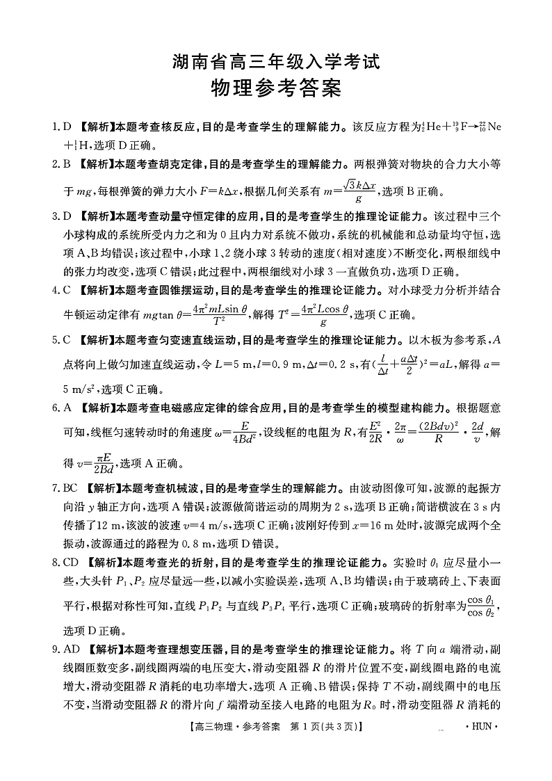 湖南省部分学校2025届高三年级8月入学考试 物理答案