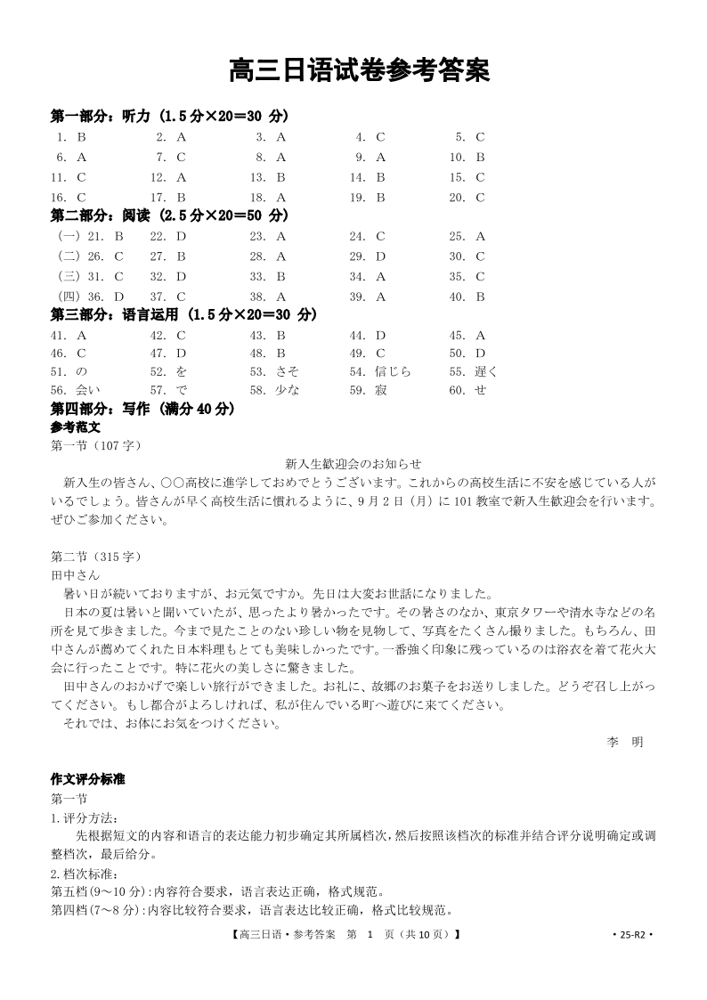 湖南省部分学校2025届高三年级8月入学考试 日语答案