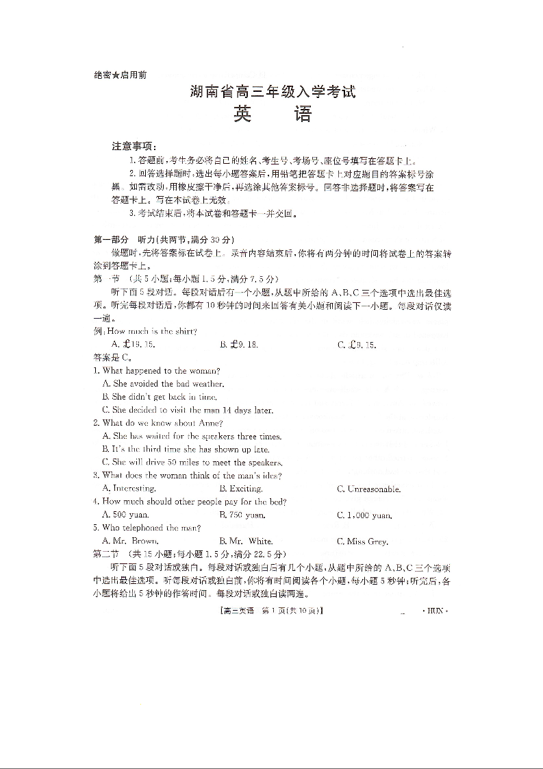 湖南省部分学校2025届高三年级8月入学考试 英语