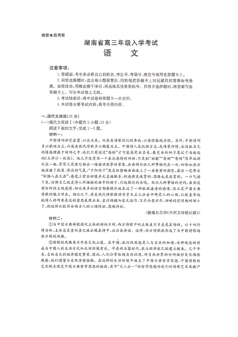 湖南省部分学校2025届高三年级8月入学考试 语文