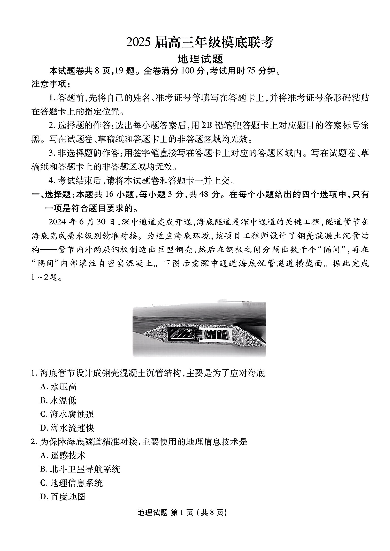 广东省衡水金卷2025届高三年级上学期8月摸底联考 地理