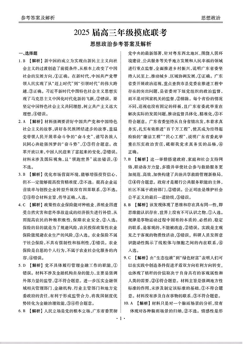 广东省衡水金卷2025届高三年级上学期8月摸底联考 政治答案