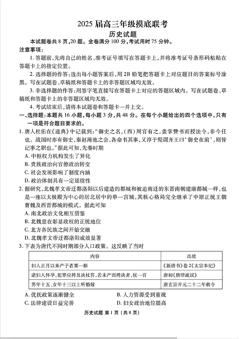 广东省衡水金卷2025届高三年级上学期8月摸底联考 历史