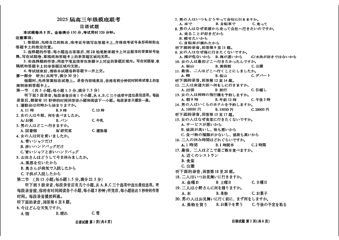 广东省衡水金卷2025届高三年级上学期8月摸底联考 日语