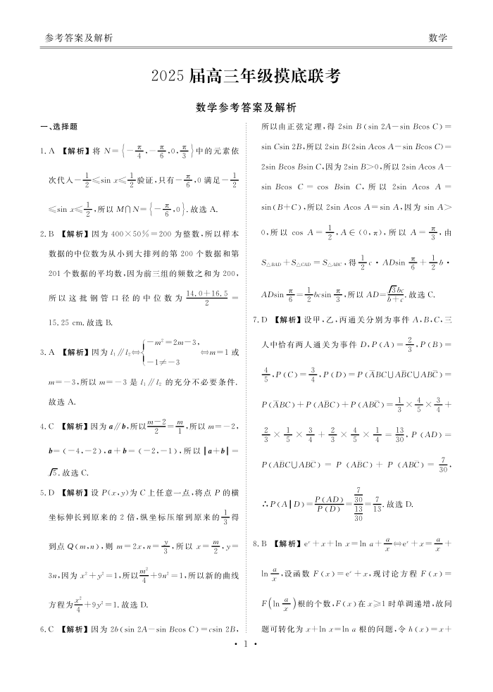 广东省衡水金卷2025届高三年级上学期8月摸底联考 数学答案