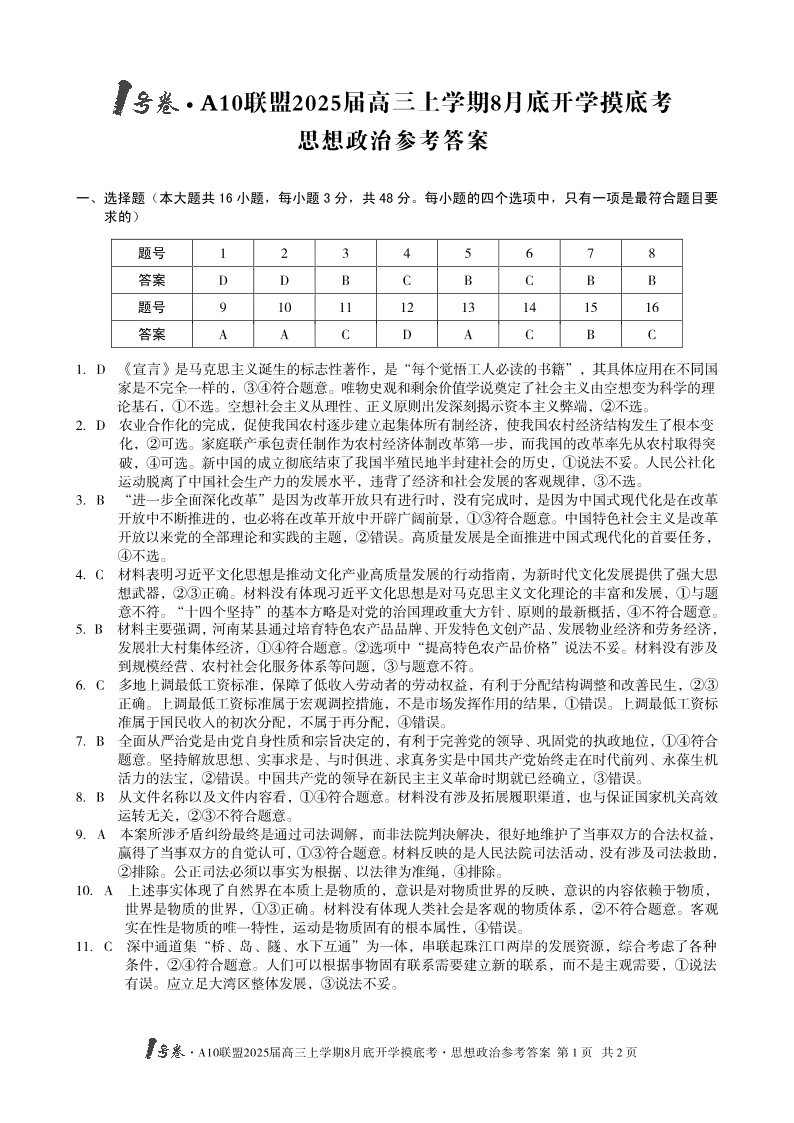 安徽省1号卷A10联盟2025届高三上学期8月开学摸底考试 思想政治答案