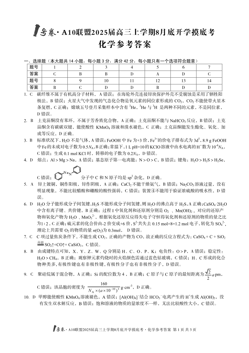 安徽省1号卷A10联盟2025届高三上学期8月开学摸底考试 化学答案