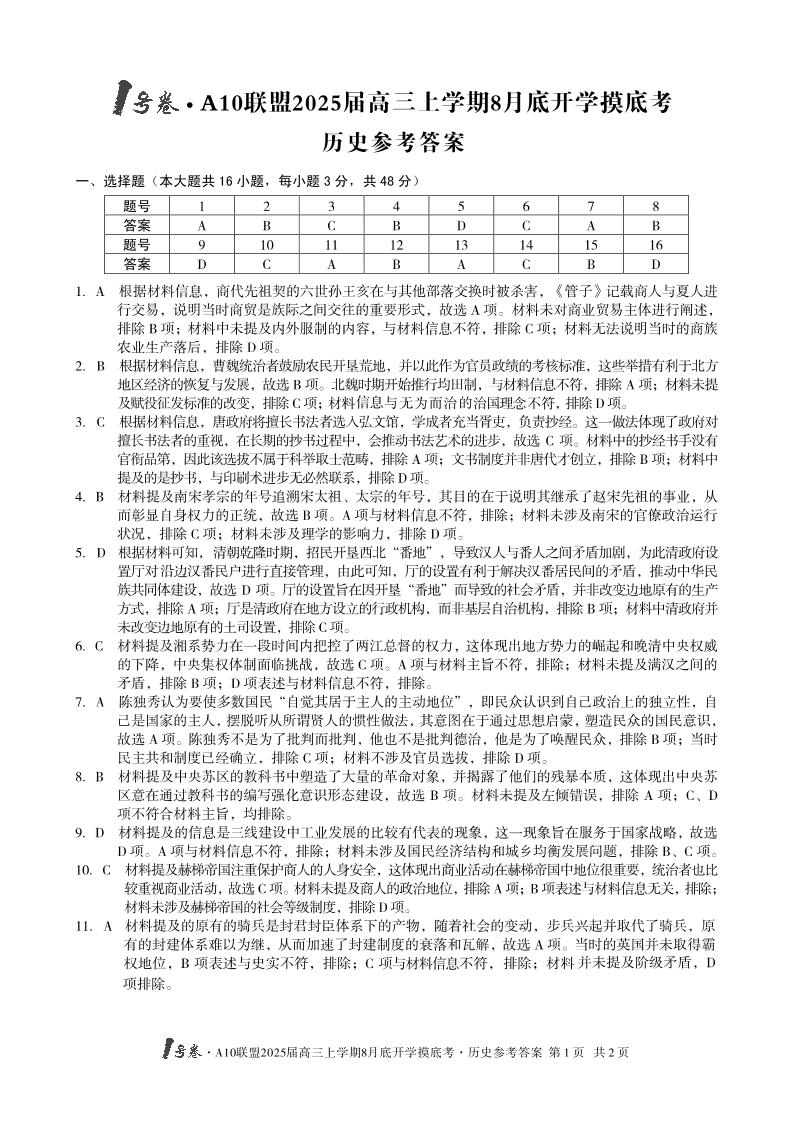 安徽省1号卷A10联盟2025届高三上学期8月开学摸底考试 历史答案