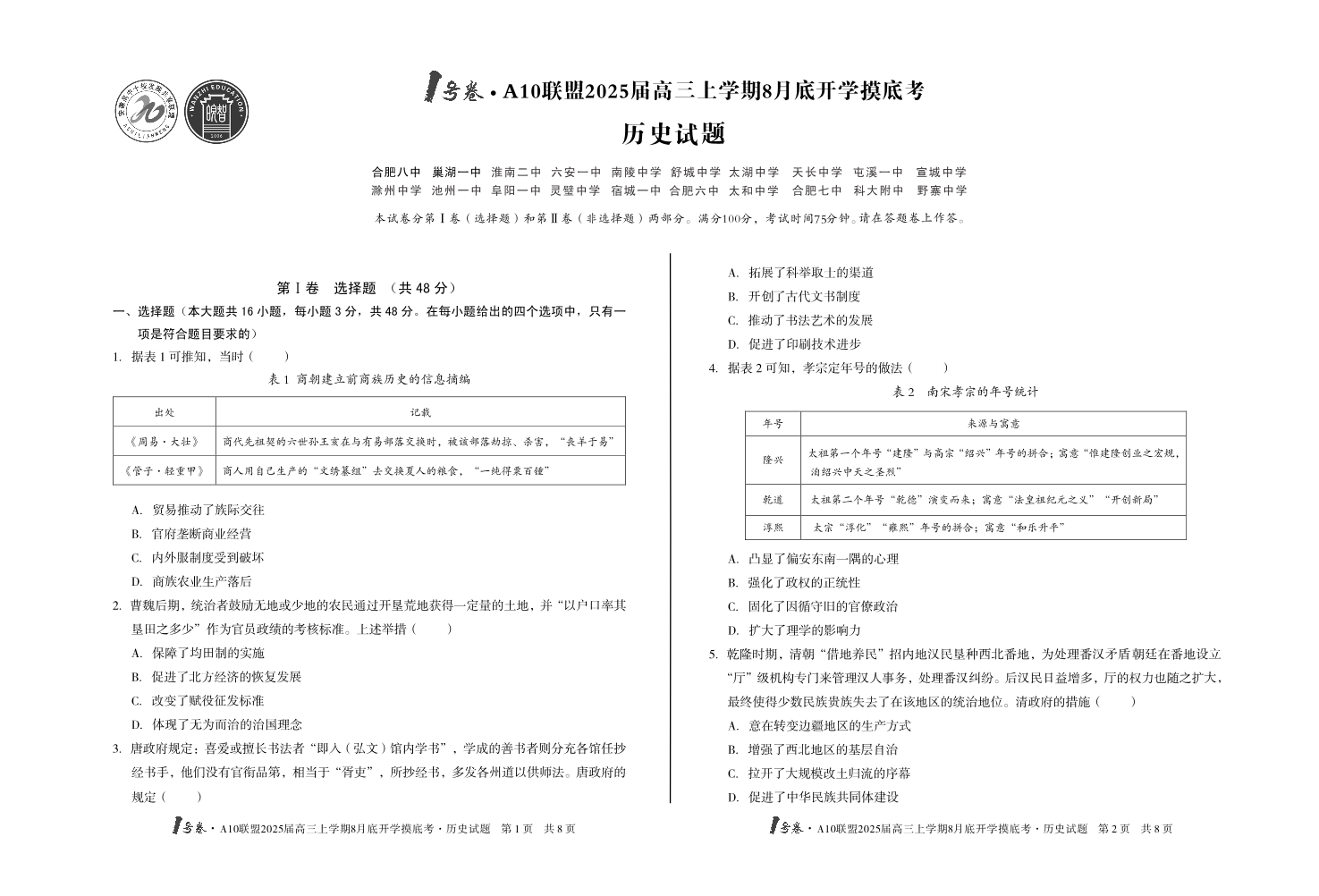 安徽省1号卷A10联盟2025届高三上学期8月开学摸底考试 历史