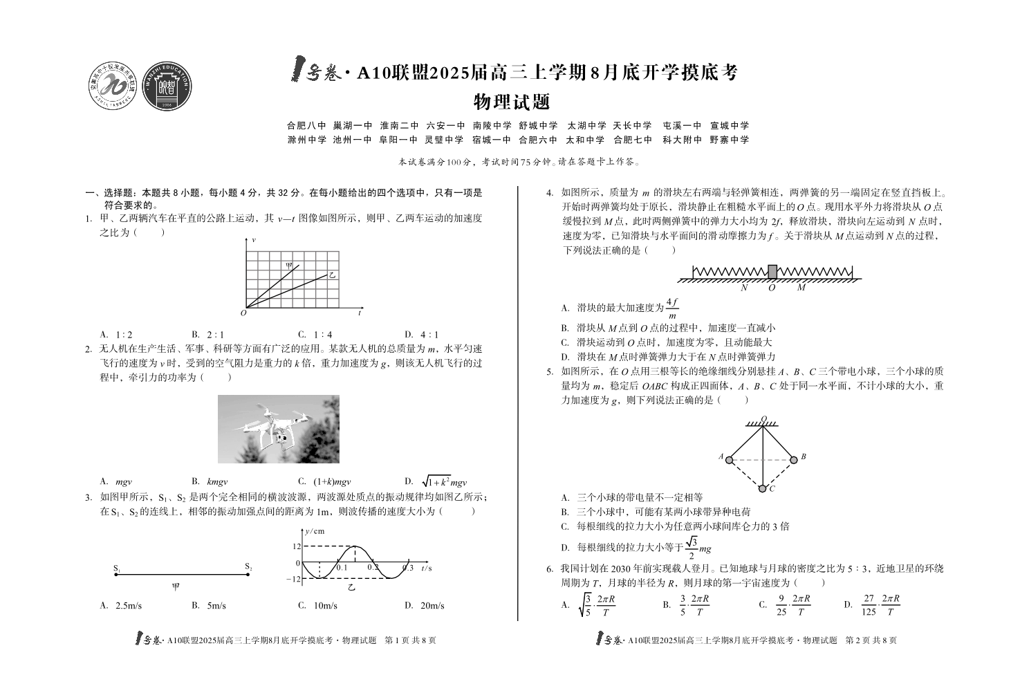 安徽省1号卷A10联盟2025届高三上学期8月开学摸底考试 物理