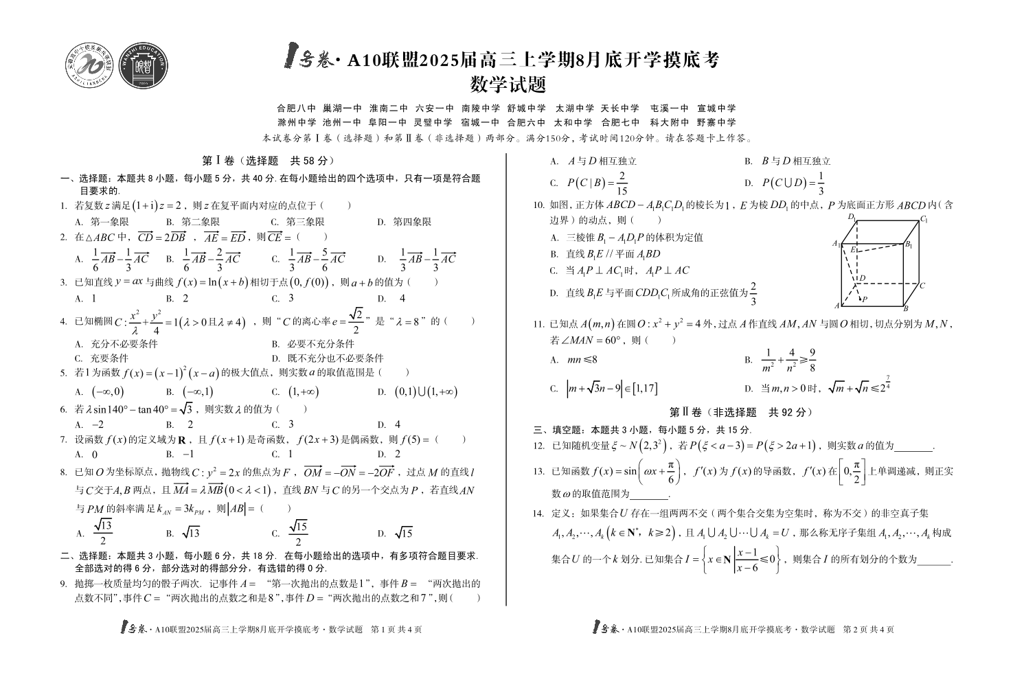 安徽省1号卷A10联盟2025届高三上学期8月开学摸底考试 数学