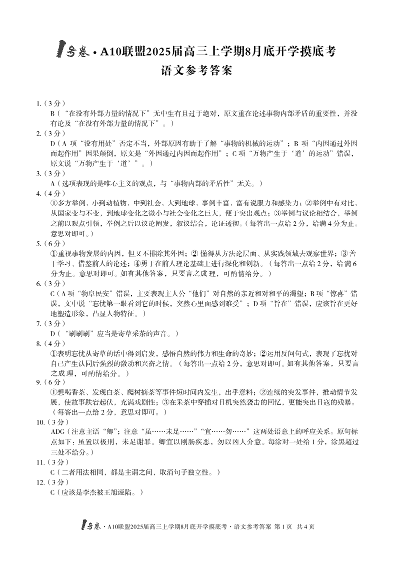 安徽省1号卷A10联盟2025届高三上学期8月开学摸底考试 语文答案