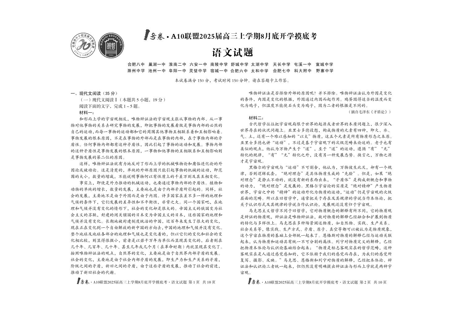 安徽省1号卷A10联盟2025届高三上学期8月开学摸底考试 语文