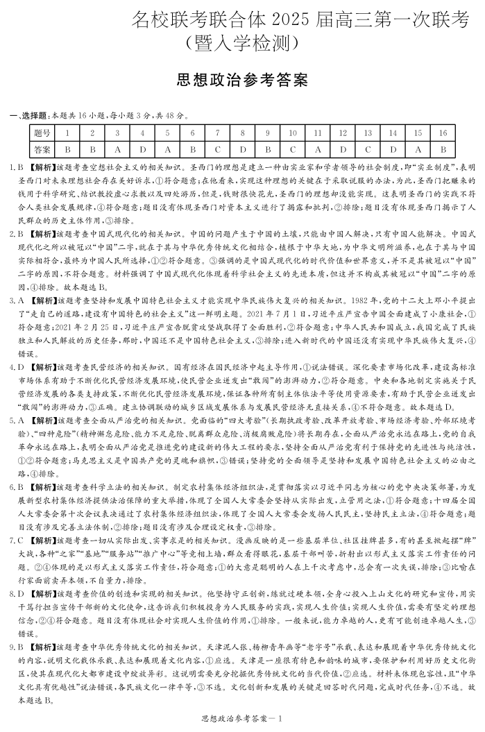 湖南省炎德英才名校联考联合体2025届高三第一次联考 政治答案