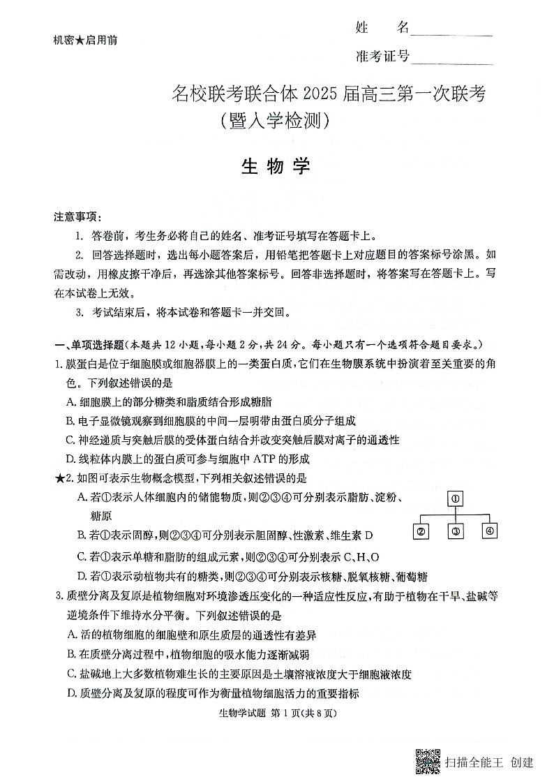 湖南省炎德英才名校联考联合体2025届高三第一次联考 生物