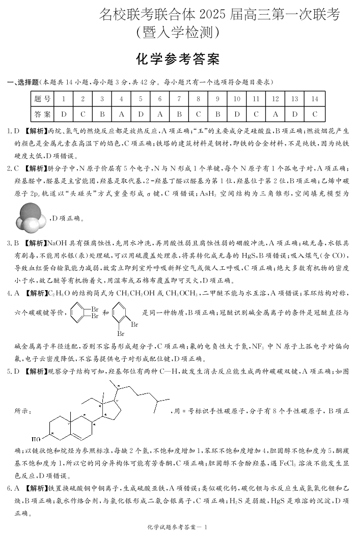 湖南省炎德英才名校联考联合体2025届高三第一次联考 化学答案