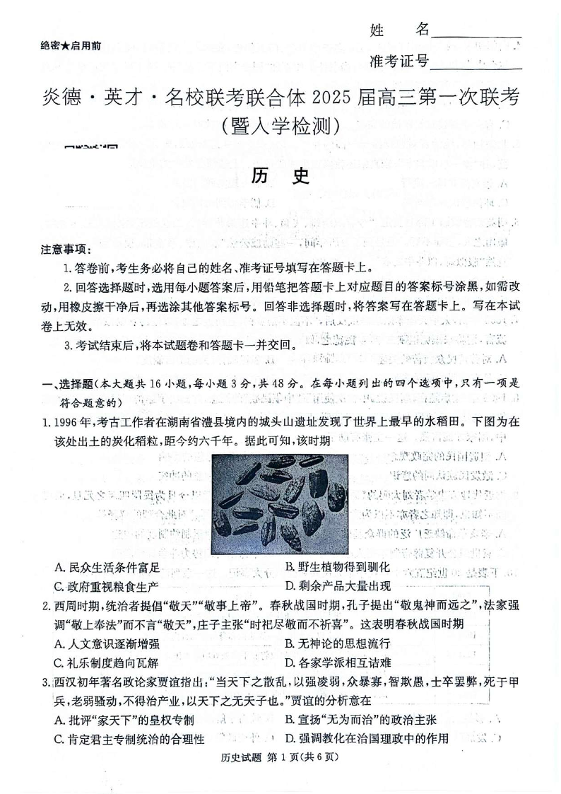 湖南省炎德英才名校联考联合体2025届高三第一次联考 历史