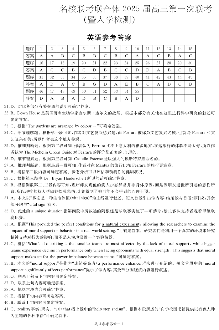 湖南省炎德英才名校联考联合体2025届高三第一次联考 英语答案