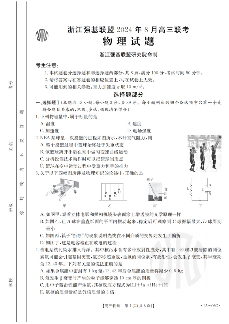 浙江强基联盟2024年8月高三联考 物理