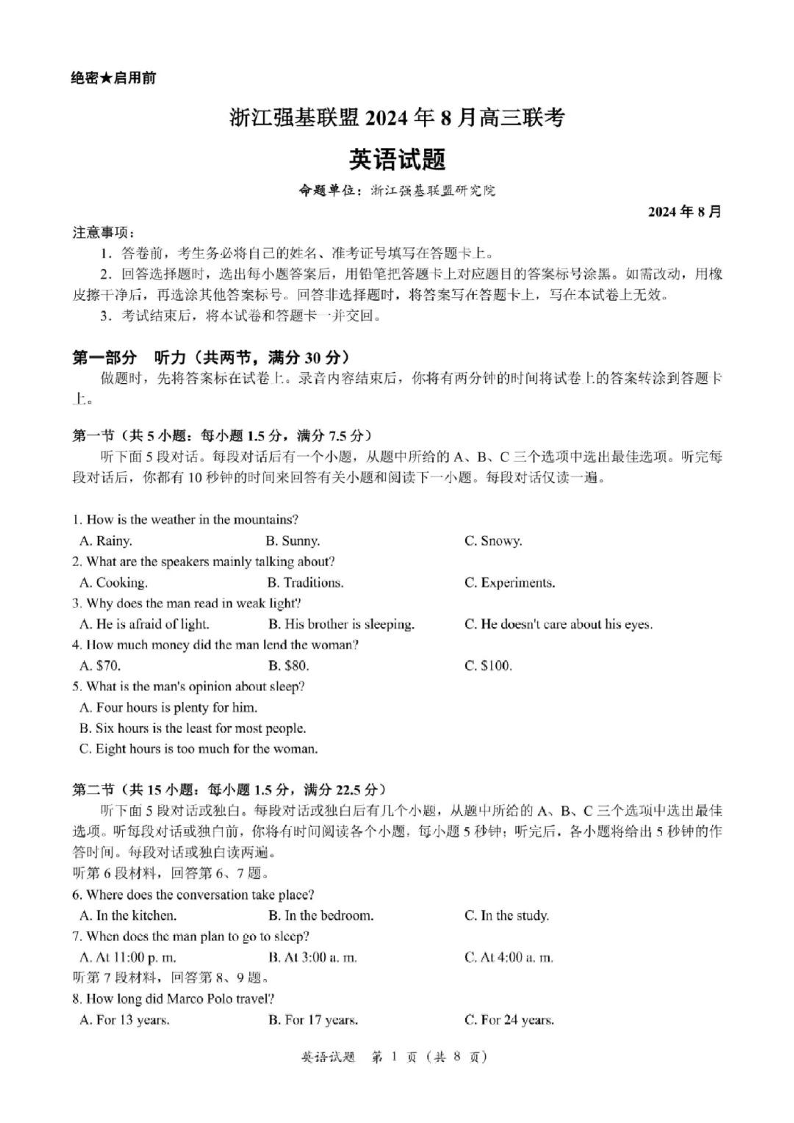 浙江强基联盟2024年8月高三联考 英语