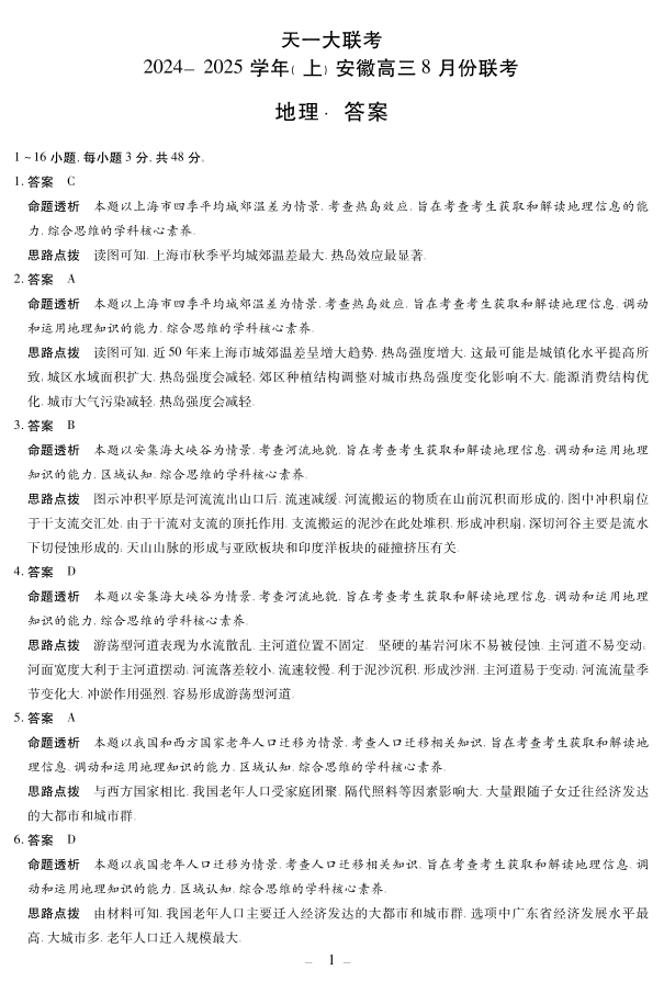 天一大联考2024-2025学年(上)安徽高三8月份联考 地理答案