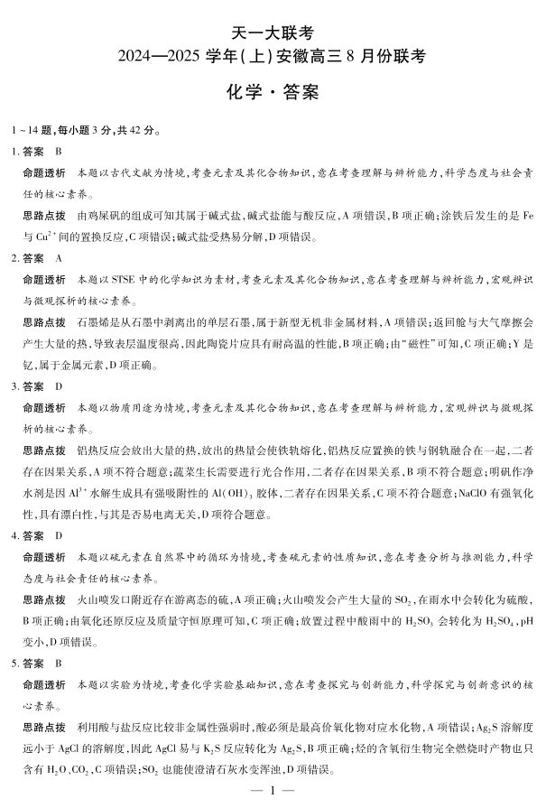 天一大联考2024-2025学年(上)安徽高三8月份联考 化学答案