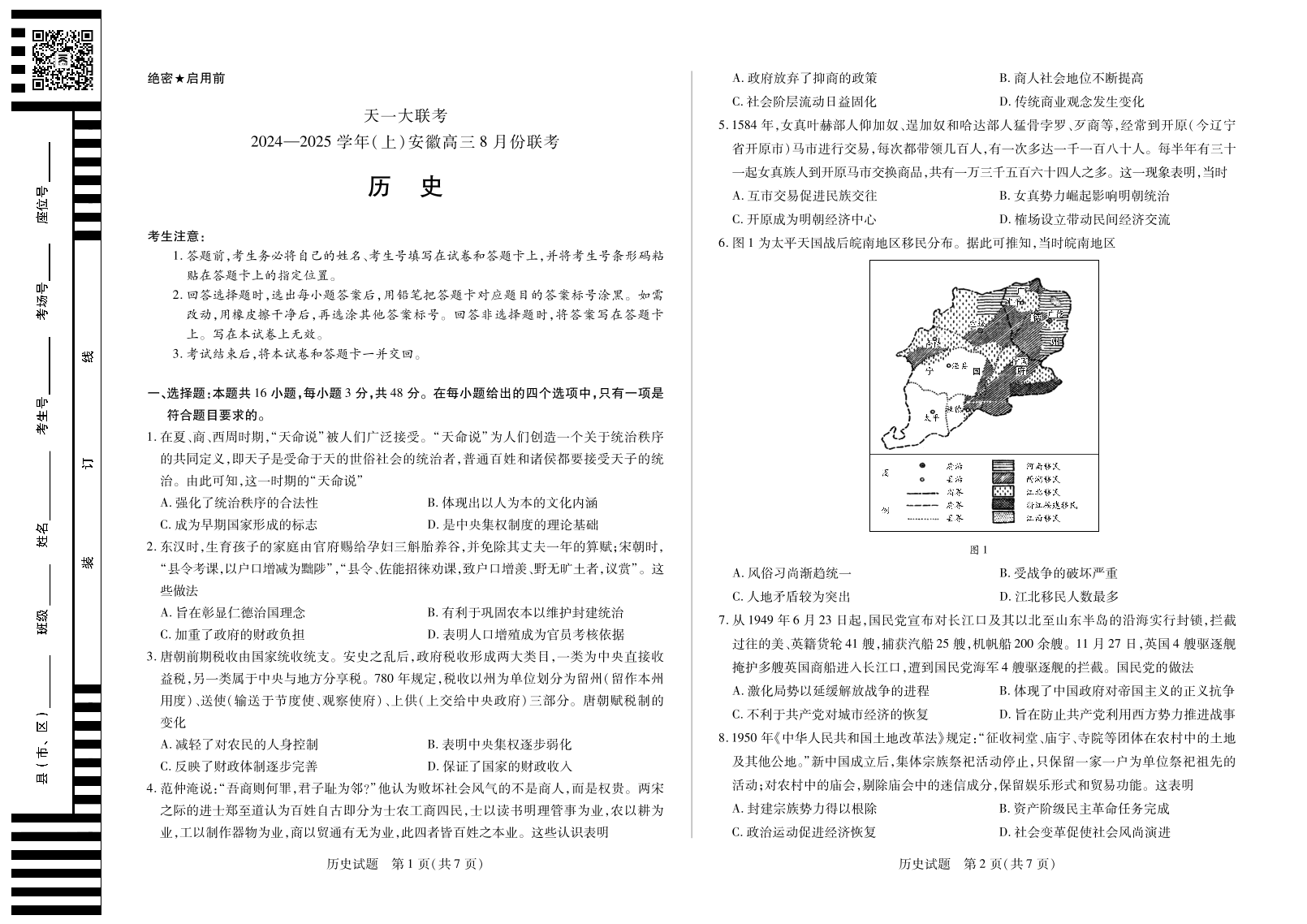 天一大联考2024-2025学年(上)安徽高三8月份联考 历史