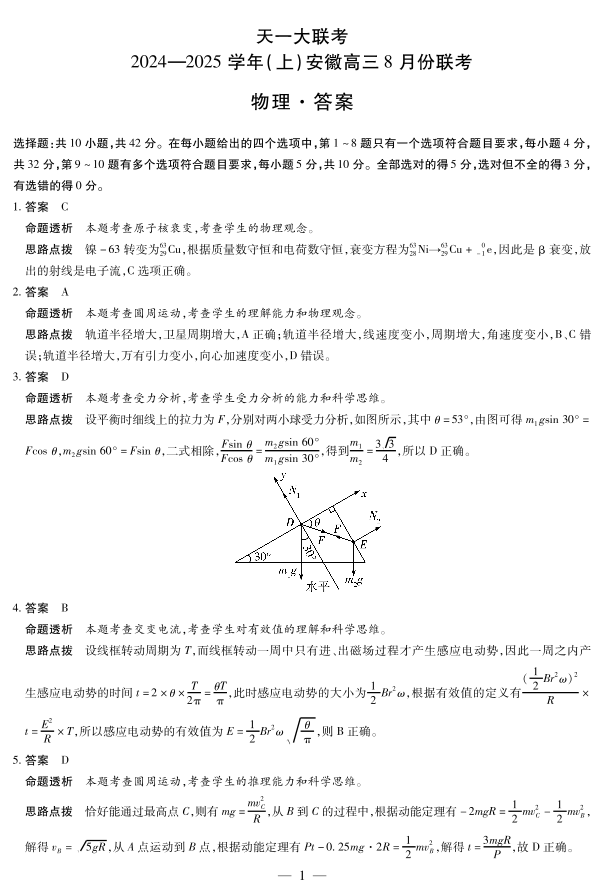 天一大联考2024-2025学年(上)安徽高三8月份联考 物理答案