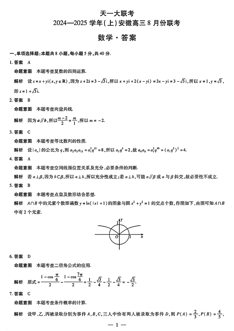 天一大联考2024-2025学年(上)安徽高三8月份联考 数学答案