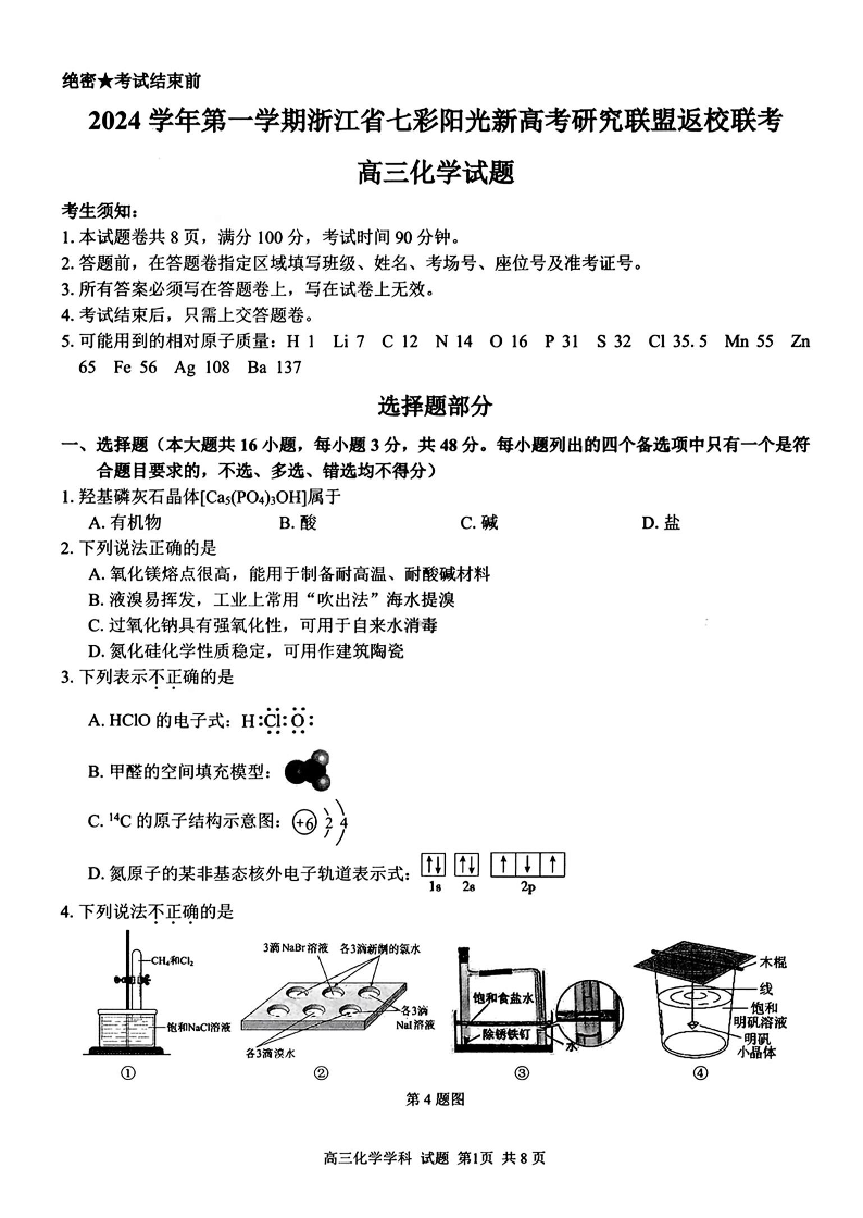 2024学年第一学期浙江省七彩阳光新高考研究联盟返校联考 化学