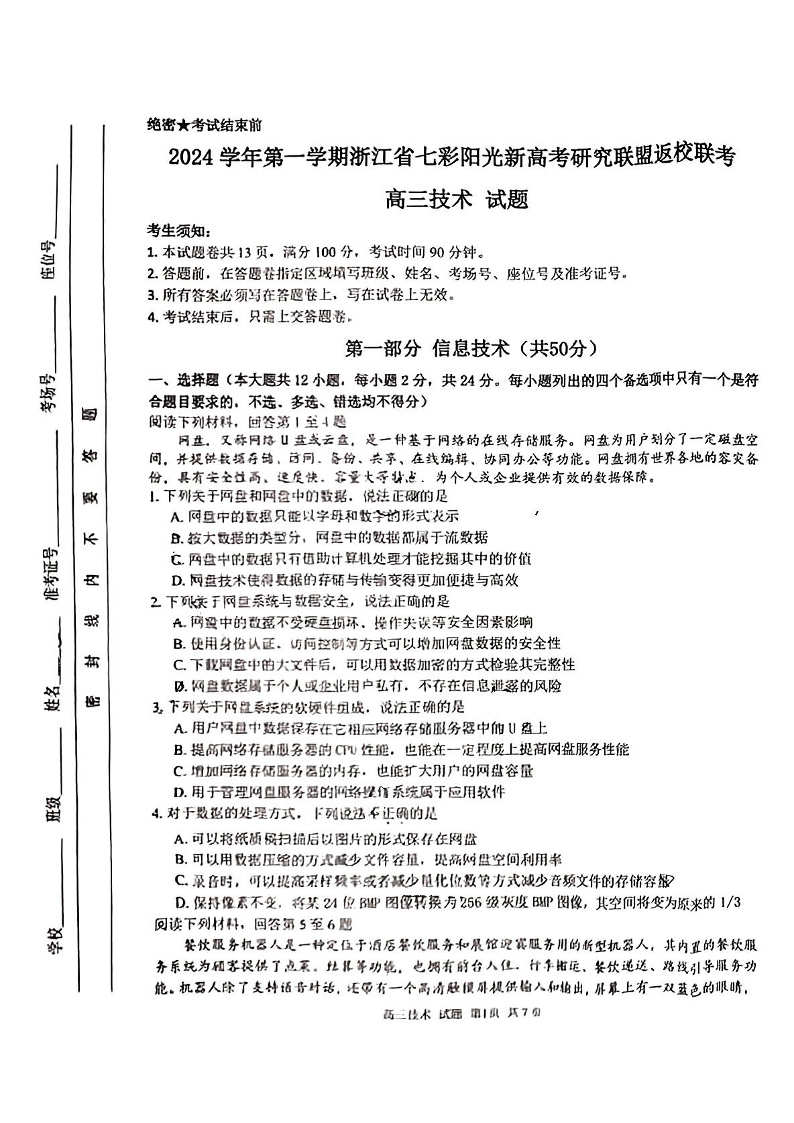 2024学年第一学期浙江省七彩阳光新高考研究联盟返校联考 技术