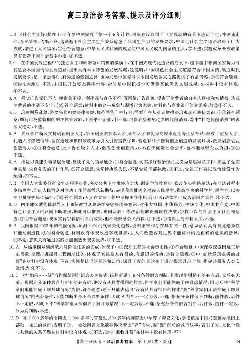 河南省开封五县考2024-2025学年高三上学期开学联考 政治答案