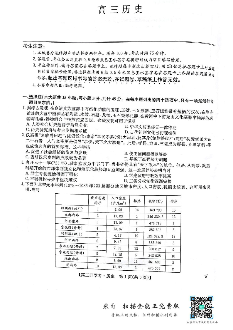 河南省开封五县考2024-2025学年高三上学期开学联考 历史
