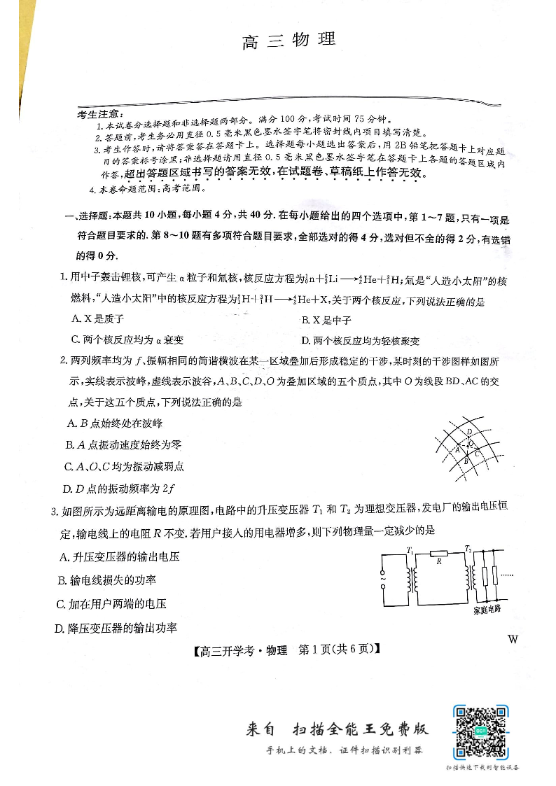 河南省开封五县考2024-2025学年高三上学期开学联考 物理