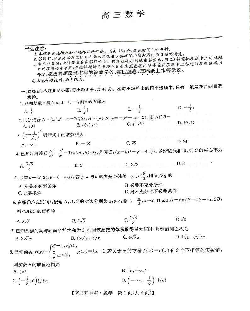 河南省开封五县考2024-2025学年高三上学期开学联考 数学