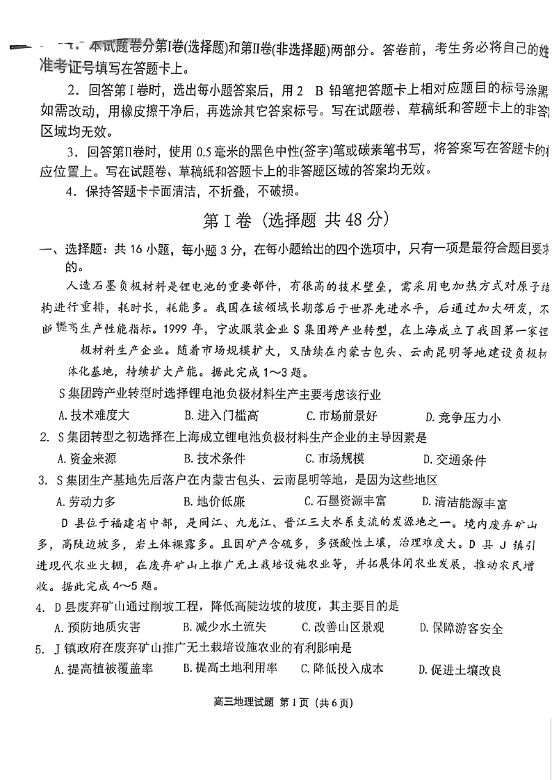 福建省泉州市2025届高中毕业班质量监测(一)地理