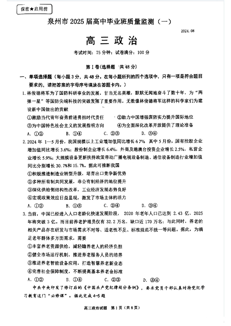 福建省泉州市2025届高中毕业班质量监测(一)政治