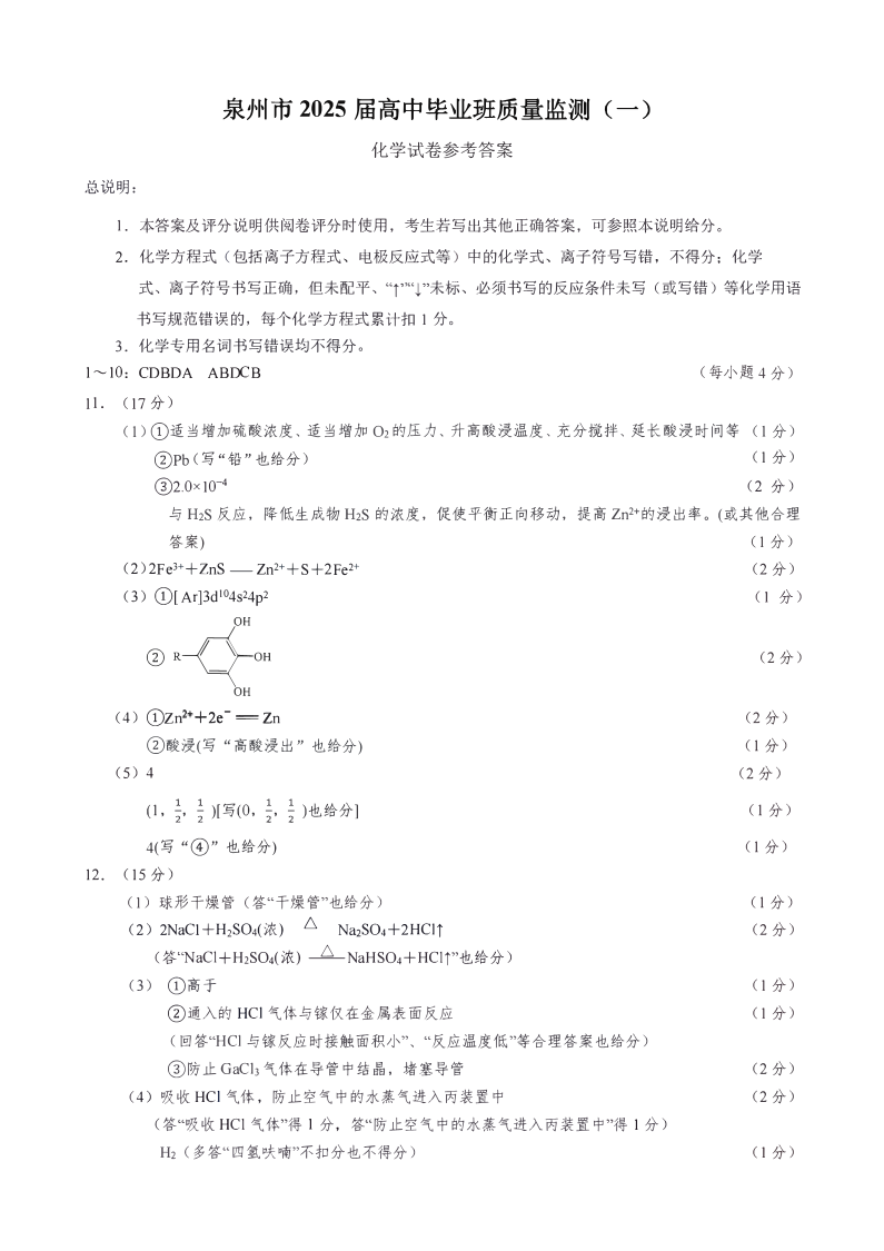 福建省泉州市2025届高中毕业班质量监测(一)化学答案